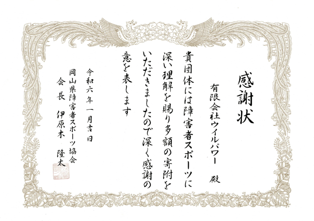 「岡山県障害者スポーツ協会」に寄付をさせていただき、